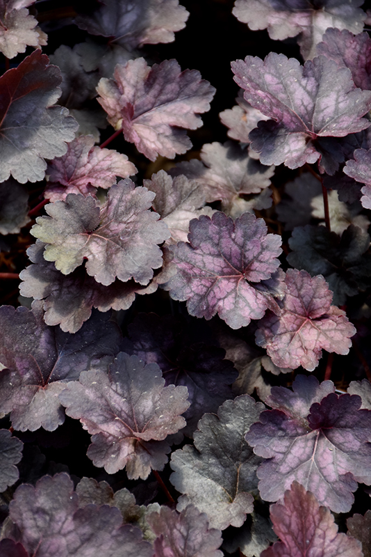 Exciting, bright silver foliage is contrasted by black veins and violet undersides; fuchsia-pink bells on dark purple-red spikes in late spring to late summer; an amazing foliage color addition with great versatility; keep soil moist in heat of summer