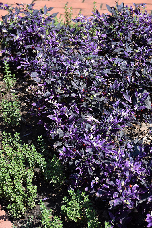 Purple Flash Ornamental Pepper is primarily grown for its highly ornamental fruit. The fruits are showy deep purple peppers with black overtones, which are carried in abundance from mid summer to early fall. It features subtle purple star-shaped flowers at the ends of the stems from late spring to mid summer. Its pointy leaves emerge white in spring, turning black in color with showy purple variegation and tinges of purple throughout the season.