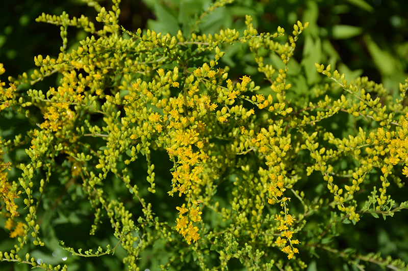 Solar Cascade Goldenrod has masses of beautiful ray-like plumes of gold flowers at the ends of the stems from early to mid fall, which are most effective when planted in groupings. Its narrow leaves remain green in color throughout the season.