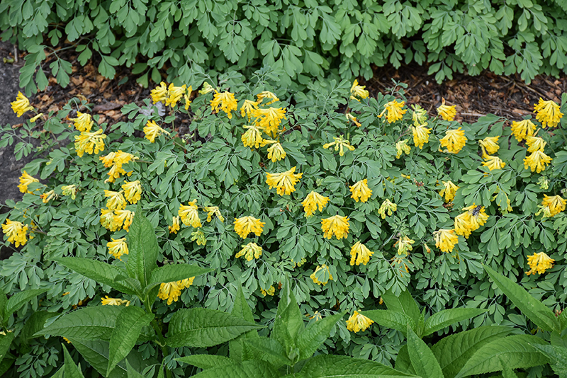 Golden Corydalis will grow to be about 12 inches tall at maturity, with a spread of 12 inches. Its foliage tends to remain dense right to the ground, not requiring facer plants in front. It grows at a medium rate, and under ideal conditions can be expected to live for approximately 5 years. As an herbaceous perennial, this plant will usually die back to the crown each winter, and will regrow from the base each spring. Be careful not to disturb the crown in late winter when it may not be readily seen!