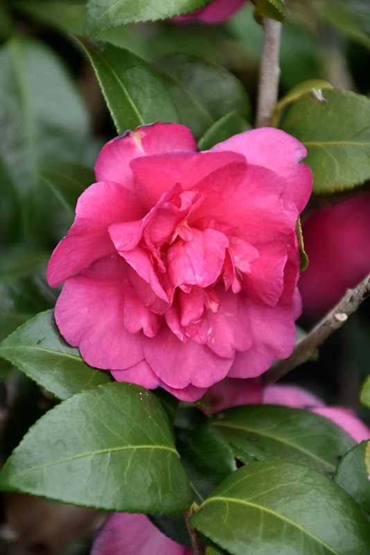 An upright shrub with lustrous evergreen foliage; covered with an abundance of double, peony form, rose pink flowers; blooms in mid-fall to early winter; provide rich, acidic, moist, well-drained soil