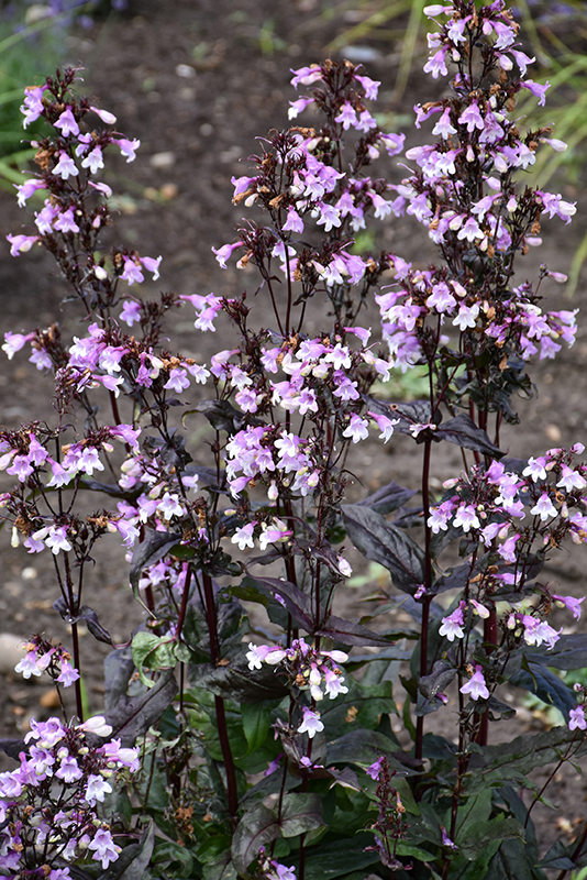 An impressive penstemon producing lavender purple flowers with pure white interiors, rising above deep burgundy-purple foliage on equally dark stems; makes a beautiful visual impact when massed in the garden, along walkways, or in borders