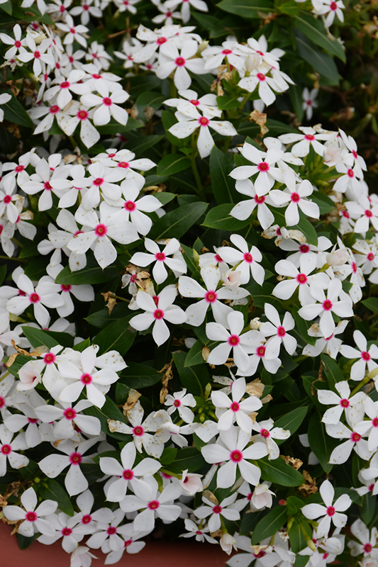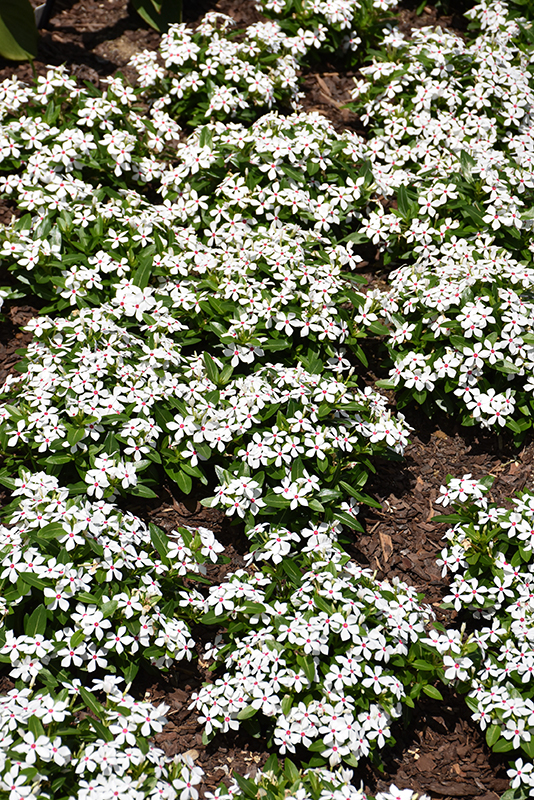 Soiree® Kawaii White Peppermint Vinca features showy white star-shaped flowers with red eyes at the ends of the stems from late spring to mid fall. Its glossy oval leaves remain dark green in color throughout the year.