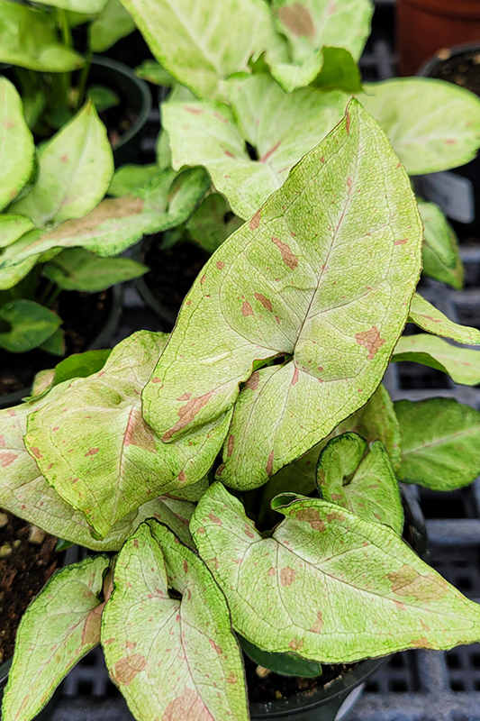A lovely vine forming variety that is perfect for indoor containers and hanging baskets; features large, arrowhead shaped foliage that are silvery green with pink speckles and variegation; prefers part to full shade and evenly moist soil