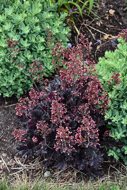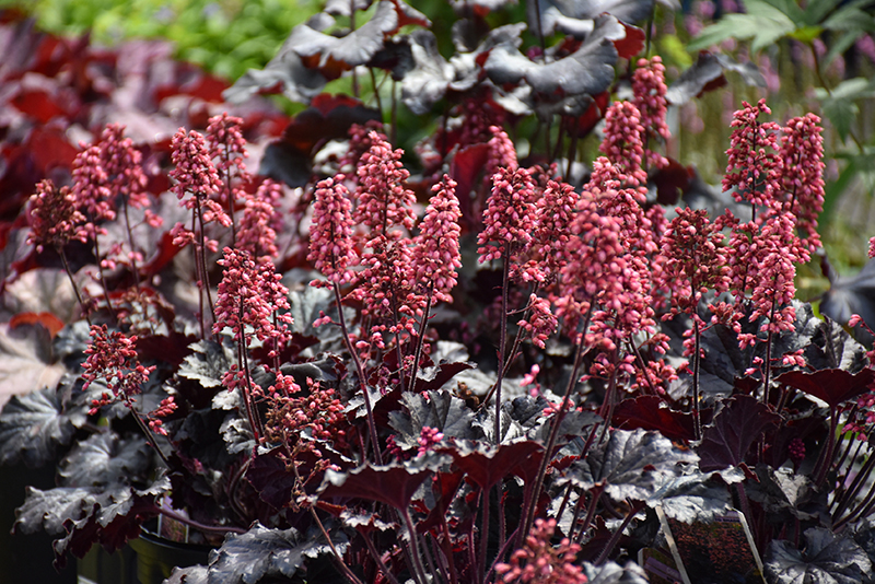 Spectacular spikes of pink bells rise from a compact, dense mound of ruffled, near-black foliage; amazing contrast to other plants; great for edging along paths or containers; keep soil moist in heat of summer