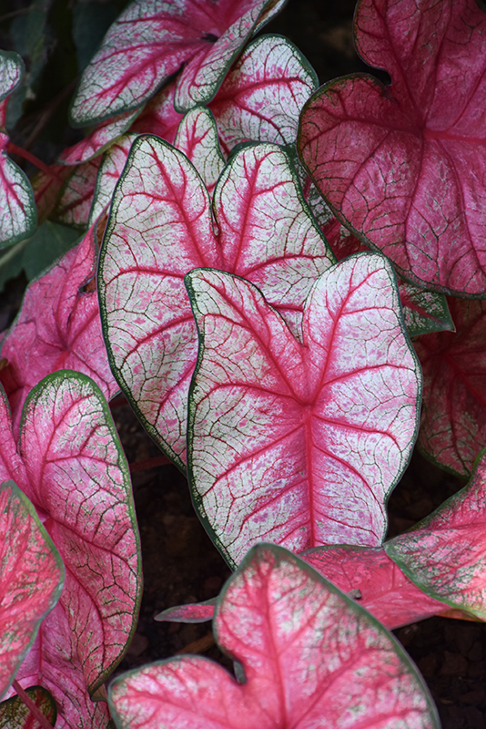 Heart to Heart™ Radiance Caladium's attractive heart-shaped leaves remain rose in color with distinctive green edges and tinges of white throughout the season on a plant with a mounded habit of growth.