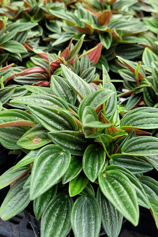 Rosso Peperomia's attractive textured pointy leaves remain grayish green in color with curious brick red undersides and tinges of black throughout the year on a plant with a mounded habit of growth. The red stems can be quite attractive and add to the plant's interest.
