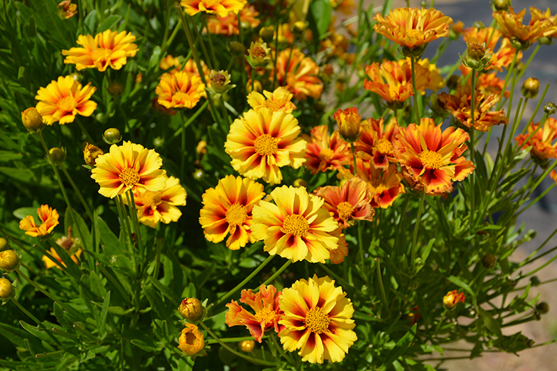 Lil' Bang™ Firewheel Tickseed will grow to be about 14 inches tall at maturity, with a spread of 18 inches. When grown in masses or used as a bedding plant, individual plants should be spaced approximately 14 inches apart. Its foliage tends to remain dense right to the ground, not requiring facer plants in front. It grows at a medium rate, and under ideal conditions can be expected to live for approximately 10 years. As an herbaceous perennial, this plant will usually die back to the crown each winter, and will regrow from the base each spring. Be careful not to disturb the crown in late winter when it may not be readily seen!