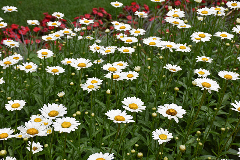 The ever popular shasta daisy is a robust perennial which blooms over a long period with happy bright flower heads borne singly on long stems for a tremendous contrast with the dark green foliage; beautiful massed along borders