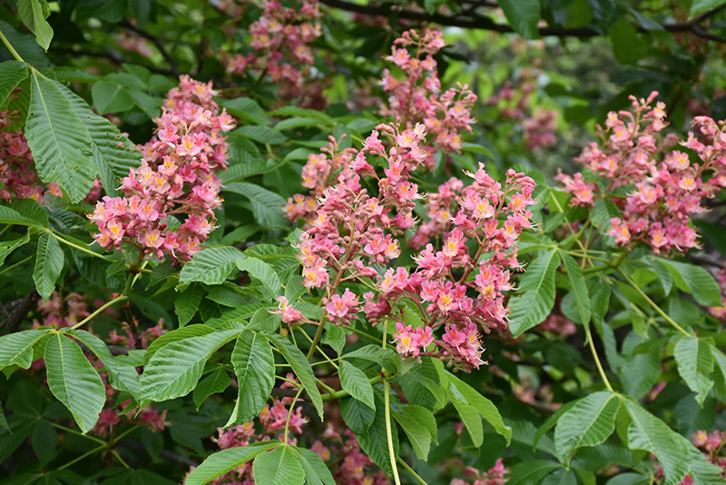 Ruby Red Horse Chestnut features bold spikes of ruby-red flowers rising above the foliage in mid spring. It has dark green deciduous foliage which emerges light green in spring. The palmate leaves turn yellow in fall. However, the fruit can be messy in the landscape and may require occasional clean-up.