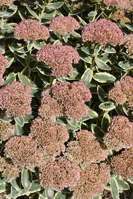 Autumn Charm Stonecrop has masses of beautiful clusters of pink flowers at the ends of the stems from late summer to late fall, which emerge from distinctive coral-pink flower buds, and which are most effective when planted in groupings. The flowers are excellent for cutting. Its attractive large succulent oval leaves remain green in color with showy yellow variegation throughout the season.